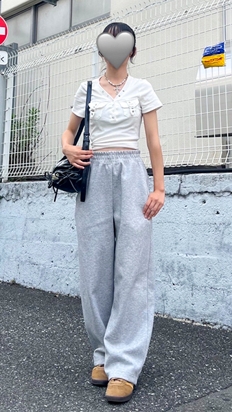 ゆったりとしたスウェットパンツとタイトなトップスを合わせることで、シルエットに強弱が生まれ、バランスの良いコーディネートに仕上がっていますね。ウエストラインをさりげなく見せることで、抜け感とスタイルアップ効果を引き出している点も◎。