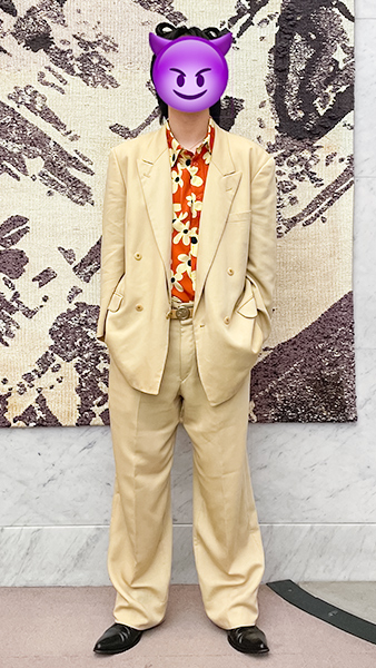 淡いベージュのセットアップを軸に、インナーで遊び心を取り入れたバランスの良いスタイリングです。